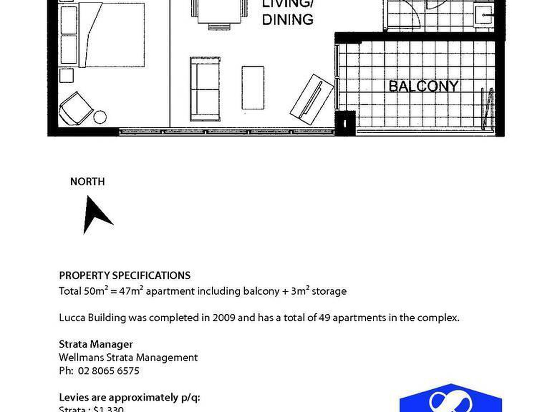 Total 50 sq m = 47 sq m apartment including balcony + 3 sq m storage