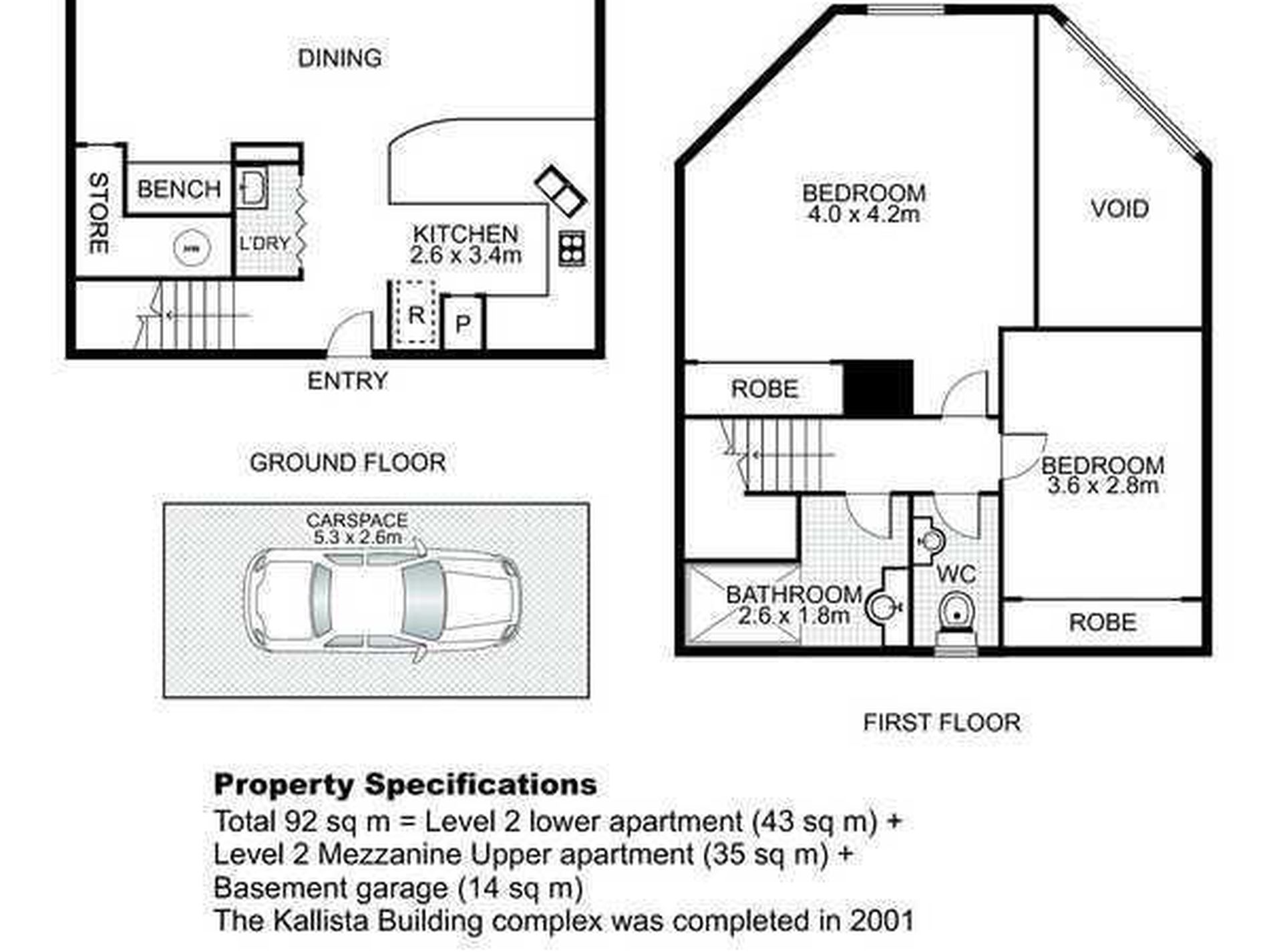 Lower Apartment (Level 2) 43 sq m + Upper Apartment (Level 2 Mezzanine) 35 sq m + Basement Garage 14 sq m