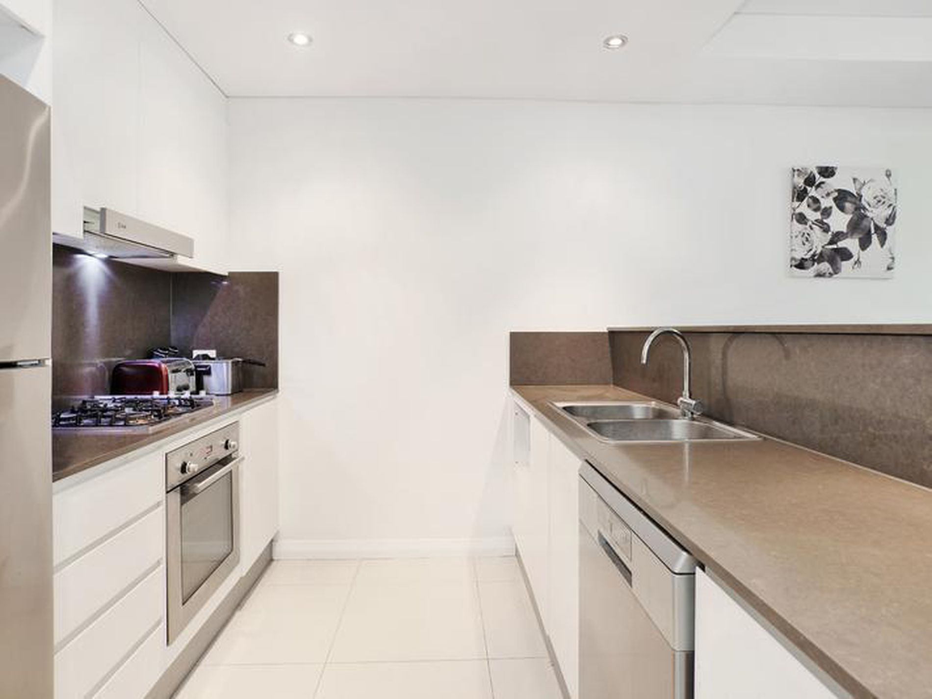 - Gas kitchen with Ceasarstone bench tops and tiled splash backs