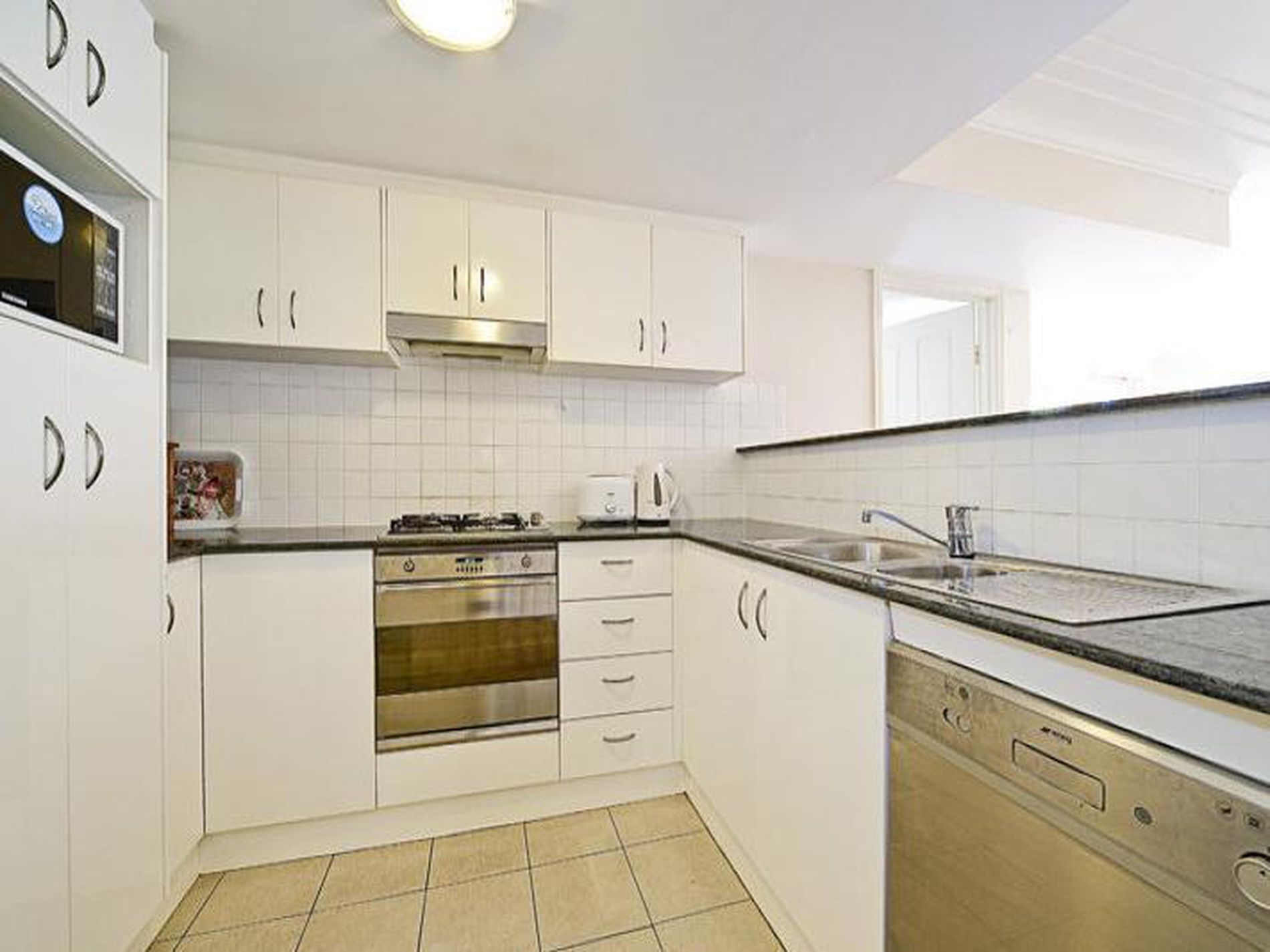 - Modern kitchen with stainless steel appliances and gas cook top
