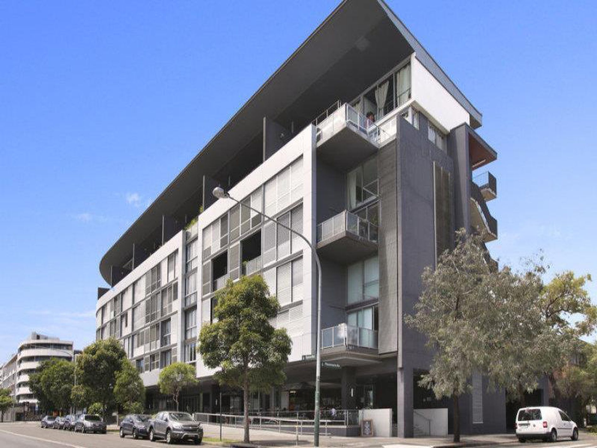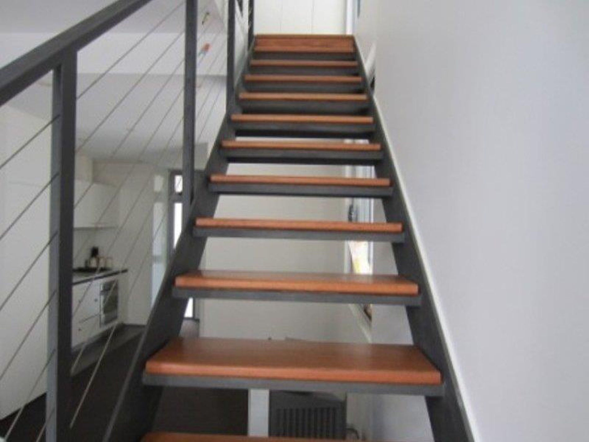 Modern loft style apartment with entertainers balcony. Staircases have timber and metal open slats to further enhance the airy interiors, which receive natural light from at least two faces.