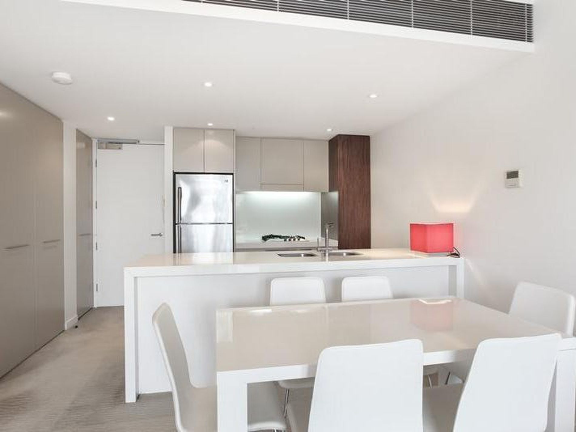 - Modern open-plan gas kitchen with timber veneers and polyurethane cabinets and imported stone and stainless appliances